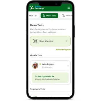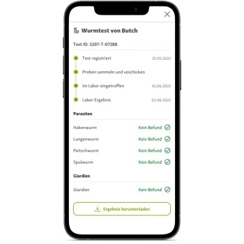 Nach Probeneingang untersucht unser akkreditierter Laborpartner deine Proben. Nach etwa 1-2 Tagen wirst du dein Ergebnis in deinem Fressnapf Kundenkonto bei Dr. Fressnapf abrufen können. Wir informieren dich zudem per Mail, sobald das Ergebnis vorliegt. Bei einem positivem Befund kannst du dir ganz einfach den Laborbericht herunterladen und mit deinem Tier einen Tierarzt aufsuchen. Dein Tierarzt wird dir eine auf dein Tier abgestimmte Wurmkur verschreiben.