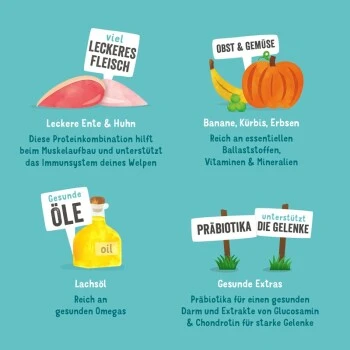 Aus leckerer Ente und Huhn, ist diese getreidefreie Spezialität perfekt auf die Bedürfnisse von Welpen ausgerichtet. Sie ist reich an hochwertigem Protein, das den Muskelaufbau unterstützt und das Immunsystem stärkt. Dieses Futter enthält Präbiotika für einen gesunden Darm und wir fügen natürliche Extrakte von Glucosamin und Chondroitin zur Stärkung der Gelenke hinzu. Als kleines Extra kombinieren wir das Fleisch mit nahrhaften Innereien (wie Herz und Niere) für noch mehr Nährstoffgehalt. Wir bereiten unser Nassfutter mit einem super gesunden Mix aus Obst und Gemüse sowie einer extra Portion gesunder Kräuter zu. Dann wird es schonend dampfgegart, um all das Gute und den Geschmack zu erhalten.