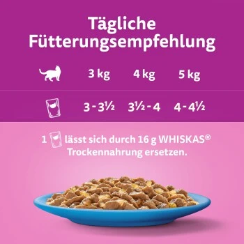 Hochwertiges Katzenfutter in Gelee für Katzen ab 1 Jahr. Verwöhne deinen Liebling mit köstlichem Nassfutter mit Thunfisch und Lachs in der Großpackung. Bereite deiner Katze eine Freude! Speziell zubereitet, um das natürlich Gute und Köstliche der hochwertigen Zutaten zu bewahren. Mit unseren Lieblingsmahlzeiten eilt deine Katze schneller als je zuvor zum Napf! Vom verspielten Kätzchen bis zur wunderbar älteren Katze enthalten unsere schmackhaften Rezepturen alles, was deine Katze für ihr Alter braucht. Zubereitet für zufriedenes Schurren … während der Mahlzeiten und darüber hinaus.